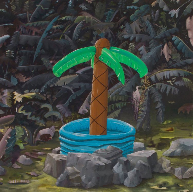 L’oeuvre de Nicolas Nicolini comporte un second niveau de lecture, aux considérations strictement picturales s’ajoute une vision critique. Des éléments liés aux loisirs et au divertissement sont souvent inscrits au coeur de ses compositions : une toile de tente, une piscine, un palmier, un bateau téléguidé, un tourniquet ou encore une balançoire. L’artiste parle de « romantisme contemporain », de scènes isolées évoquant une forme de nostalgie de vacances en famille où le rapport avec la nature est plus ou moins authentique. Si les objets semblent anodins, ils contiennent pourtant un propos sociologique. En creux, l’artiste esquisse un regard critique sur une société où les apparences priment sur la pensée et l’expérience. Le décor est le sujet. Les objets vecteurs d’artifice subsistent à la figure humaine. Les peintures soulignent une relation galvaudée non seulement à la nature, mais aussi aux notions de voyage, de vacances et de loisir. Les objets détournent l’expérience physique et sensorielle : le palmier est planté dans le jardin, il est arrosé par un système automatique ; la mer ou le lac sont réduits à l’échelle de la piscine ; le bateau est commandé par une manette. La relation à la nature est maîtrisée et contrainte à l’échelle du corps humain. Les objets participent à une duperie généralisée, celle de la théâtralisation de nos décors quotidiens.”