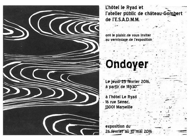 Le jeudi 25 févier 2016 à 18h30, à l’hôtel Le Ryad Marseille vernissage de l’exposition « Ondoyer » réalisée dans le cadre des Ateliers Publics #Esadmm de Château-Gombert.