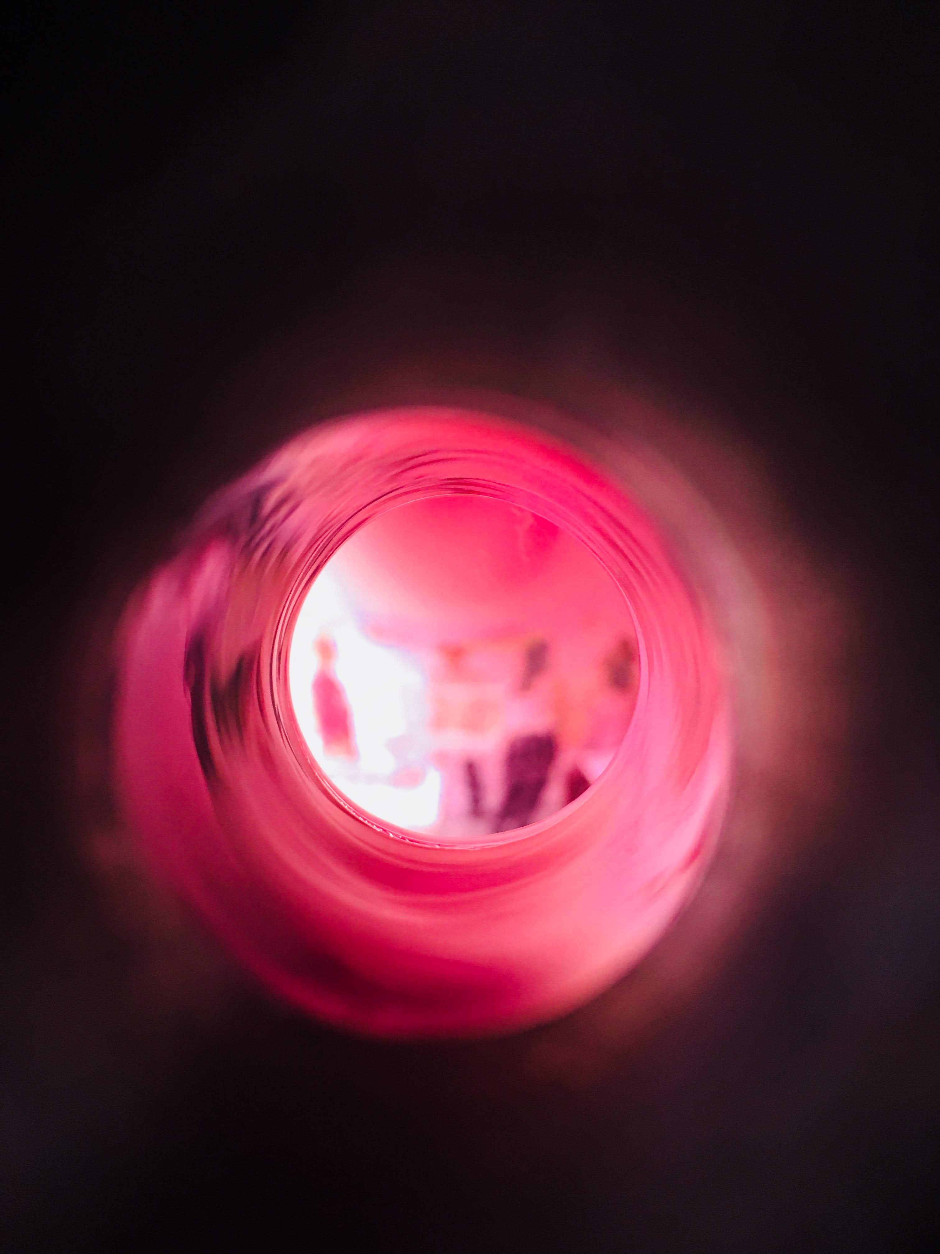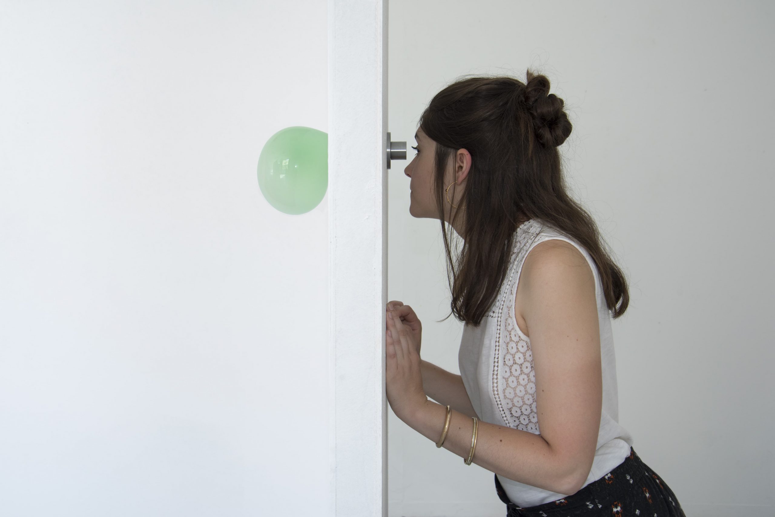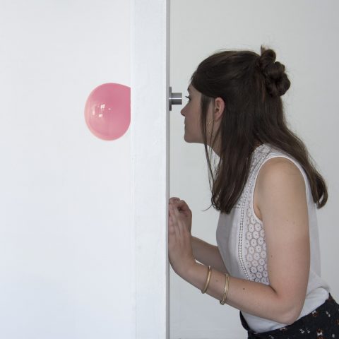 J’ai souhaité intervenir sur la cloison -deux pièces côte-à-côte dans un même logement sont la première forme de voisinage. J’ai travaillé sur une interpénétration des espaces en parasitant la cloison par des œilletons. Si transpercer une cloison est à priori un acte transgressif, ma démarche devient poétique grâce au rôle et à la manufacture de « bulles » et leurs caractères aléatoires. Ces filtres colorés permettent de voir une réalité différente, la bulle de verre soufflée au CIRVA* crée une expérience visuelle relative à la forme et à l’épaisseur du matériau. Le verre transforme, déforme le décor/paysage qu’il donne à voir à l’instar d’un rêve ou d’une illusion. Le filtre coloré fait référence au cinéma dans lequel il est utilisé pour traduire une émotion, créer un univers. Ces objets de curiosité créent un scénario qui mêle intimité, sensualité et érotisme. L’emplacement des judas reste à définir par l’utilisateur, ce qui invite au jeu. Les points de vue peuvent être multiples, du ras du sol jusqu’au plafond. La pièce en acier tournée filetée permet d’inverser le sens du judas.