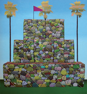 Mon intérêt premier n’est pas de raconter des histoires. Le processus d’élaboration d’une toile s’effectue par un premier montage sur Photoshop. Les tableaux présentés mettent en scène des installations virtuelles soutenues par des sculptures principales. Ce n’est pas un monde désenchanté ou dévasté mais détaché où le sentiment de distanciation projette l’ombre du faux. L’architecture y devient perverse et la séduction immédiate.