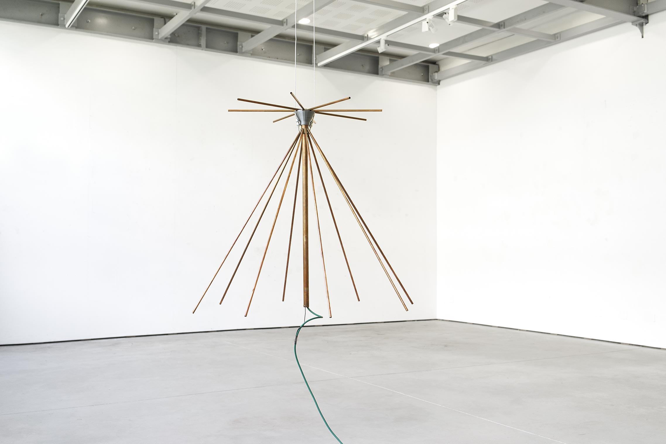 Chants hertziens est une installation qui se déploie autour de deux antennes qui détectent les ondes électromagnétiques.