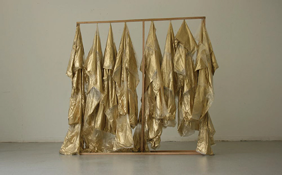 Une organisation s’est établie. Bois de manguier, plastique, pigment doré. Récupérés et bon marché. Le bois est le cadre fondateur, ossature pourtant vacillante. Ecorché, patiné, modulé. Des tasseaux minces, fragments en exil d’un arbre dont on ne retient ordinairement que les fruits. La structure est « pragmatique » : portique, présentoir, étalage. La première image est l’emprunt familier d’une idée de mobilier. Des gangues plastiques sont pendues au châssis les unes à la suite des autres. Cocons d’insectes industriels, cosses de fruits artificiels, manteaux informes. Le réalisme immédiat du portique de galerie de prêt à porter est désactivé. Le pigment volatile est happé par les dispositions électrostatiques des poches. Vibration de la couleur. La légèreté du matériau offre à l’oeil une impression de bronze souple. Un séchoir pour les peaux du Ciel en fond d’or. Une coupure symbolique avec le réel. Une sensation de vestiges des choses et des corps. Le portement du luxe peut-être. Para-chutes suspendus. La métaphore d’un autre genre fabriqué. Le scénario concret qui rassemble les traces des choses oubliées et des formes suspendues comme les dépouilles d’une étrange marchandise…