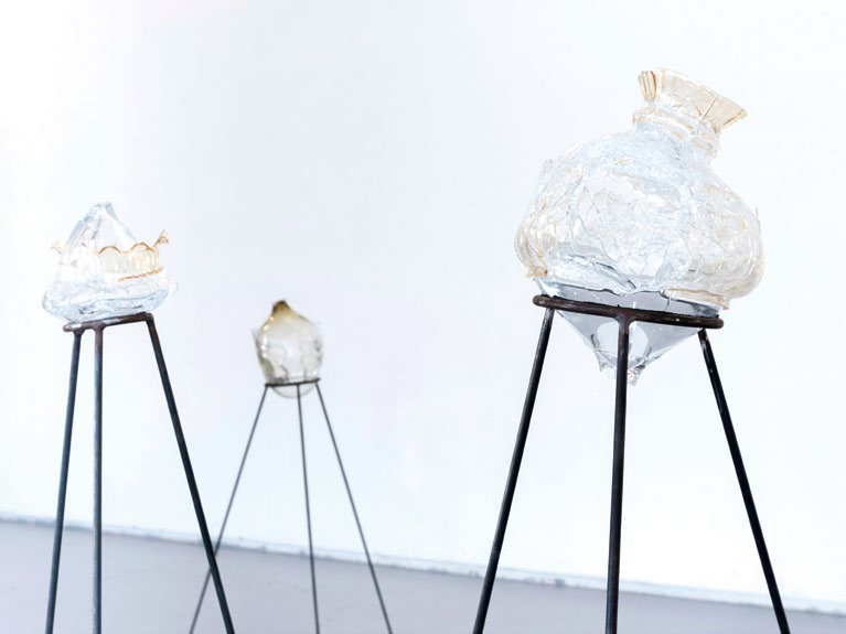 Je me suis donc posé des questions sur les choses qu’on oublie, ces objets pérennes qui persistent dans notre espace urbain. Dans mon imaginaire, ils ont commencé à muter, à s’assembler. Ils sont devenus des choses hybrides qui se mélangent et cohabitent ensemble. Je me suis donc intéressée à des outils destinés à créer ou révéler des mutations propres à chacun de leurs composants. Ces recherches m’ont amenée à réaliser de nombreuses expérimentations violentes basées sur des rapports de forces entre matières appliquant des actions comme brûler, casser, couper, coudre ou encore lacérer.