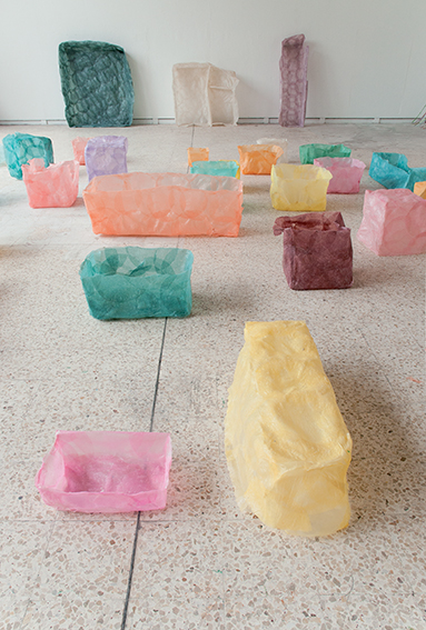 Le résultat donne une forme colorée, d’apparence géométrique se référant au Minimalisme. Mais sa tangibilité tient à la matière. Une apparence de fibre de verre extra-fine confère aux pièces une dimension délicate et fragile. Certains blocs ont subi des chocs, des brisures, des cassures qui mettent en exergue leur extrême précarité. Ces éléments révèlent une rigidité dans leur aspect formel, mais elle est détournée par la malléabilité et l’instabilité de la matière. Cet aspect fait référence à l’Antiforme, mouvement associé au travail de l’artiste Eva Hesse. Par ses processus de travail et ses matières premières, l’artiste avait introduit une certaine sensibilité dans un courant de pensée emprunt de l’Art Minimal.