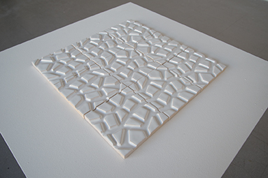 Afin de concevoir un objet inspiré de mes déambulations urbaines, il me fallait trouver une traduction, un support, un déplacement forme/fonction. Le carrelage est une évolution du motif de ces villes traversées. Le projet Relief sur ville élabore une création articulée autour de la production de deux modèles de carrelage. Il se compose de deux prototypes de carreaux en céramique qui mettent en jeu des formes organiques, géométriques et symétriques, une impression sensible et un rapport tactile. La première série est sérigraphiée, utilisant des encres aux pigments photoluminescents sur un motif composé de courbes de niveaux. La seconde, posée au mur, possède une surface de plan en bas-relief dont le toucher permet d’expérimenter et d’imaginer le relief topographique de la ville. Les carreaux s’imbriquent pour dessiner des motifs urbains, comme une extraordinaire image de ville qui peut se déployer sans limites.