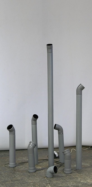 La partie supérieure des tuyaux tourne sur elle-même comme un périscope. Les « couinements » du plastique s’interprètent comme un commentaire. Ils sont une foule de badauds insatiables, à la recherche de la moindre action.