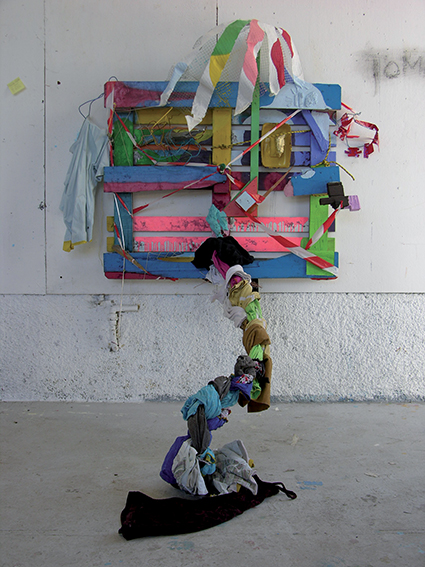 De ce mélange entre geste pictural et tridimensionnalité, il ressort des chimères colorées et brinquebalantes, des utopies matérialistes et des reconstitutions d’éléments de lieux laissés en friche pour nous parler du monde, dans cette limite entre le délaissé et l’habité.