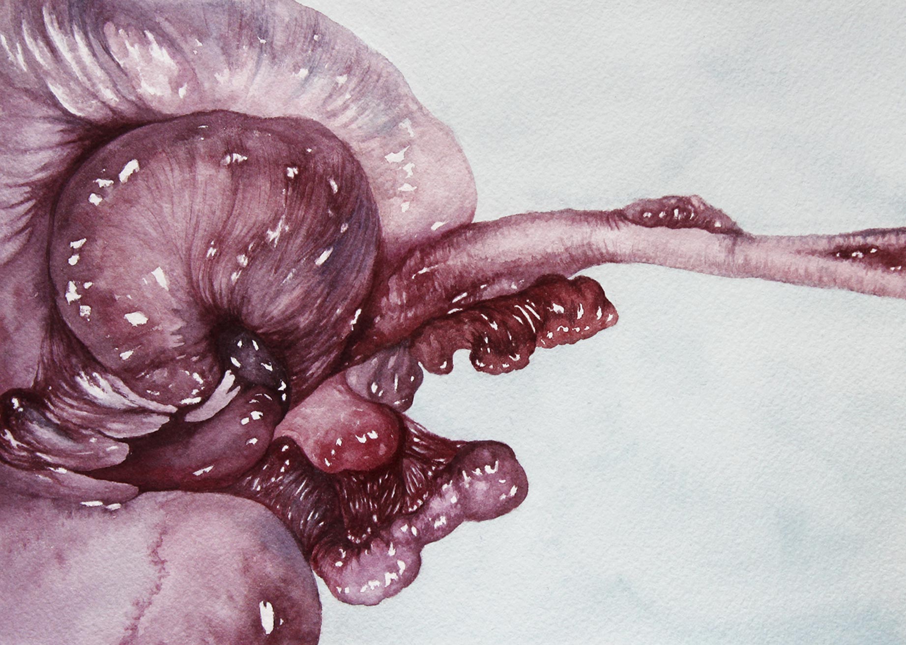 Ainsi, par l’aquarelle – liquide, visqueuse, saignante – incarner une réflexion poétique sur cette morphologie, se dessinant comme une veine minérale, flore intestinale, excroissance arboriforme…