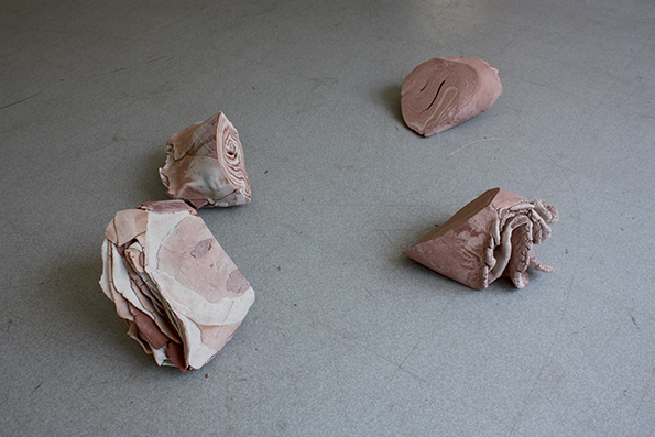 L’argile est une matière traditionnelle qui se choisit, une substance élémentaire, qui se modèle qui se pétrit et trouve dans son aboutissement sa forme sculptée. Elle recueille les empreintes de celui qui la touche, enregistre les mutations qui interviennent dans sa chair. Elle garde la mémoire de son façonnage et se nourrit de toute cette archéologie de gestes. On dicte souvent aux matériaux malléables ce que l’on souhaite réaliser, on plaque un sens sur leurs propriétés physiques, mais en ce qui concerne une glaise plastique comme l’argile, il s’agit d’un va et vient, un dialogue perpétuel entre les mains et la terre, retour d’expérience dans ce qui est mis en œuvre. Cette pâte froide, inerte et lourde, alors en mouvement sous mes doigts s’anime comme par magie et se réchauffe dans un souffle, une vie nouvelle. Puis se fige dans le mouvement, dans la courbe évolutive d’un commencement et d’une fin qui tombe comme une mesure.