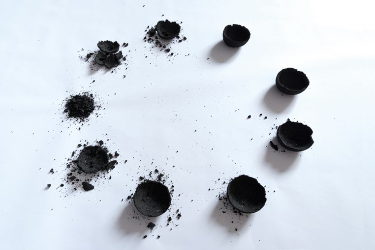 Le bois, en fines planches, se déforme et grise avec le temps. Je crée un jeu entre peau et ossature pour jouer sur ce que les modifications viendraient révéler naturellement. Entre plein et vide, lumière, couleur, cet apport graphique donne une autre vision d’une altération qui devient ici positive. Le charbon et le plâtre de contenants s’effritent, les formes des uns comme des autres se redéfinissent, leurs confrontations et leurs interactions questionnent les notions de fragilité et de traces. Ils influencent leur modification qui passe par une coloration — noir/blanc — et leur destruction ramène l’objet à son état initial de poussière.