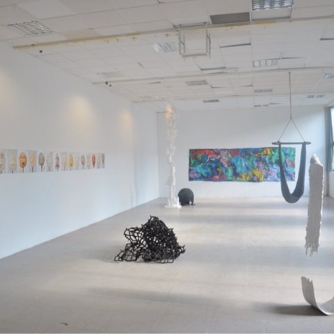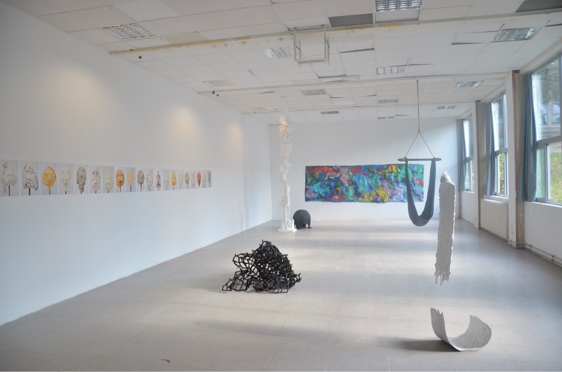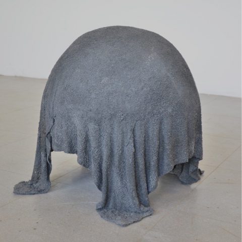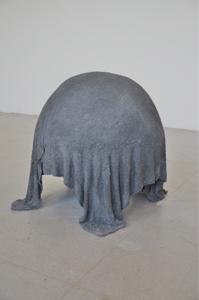 J’essaye de faire voir des choses sans vraiment les voir. Le geste de recouvrement produit une présence fantomatique. Des matières non rigides, qui ont l’air d’être solides, semblent capables de recréer un élément organique ou une sensation physique. La matière semble comme soulevée par de légers volumes d’air. Cela m’évoque des souffles. La pesanteur est présente, prise dans une sorte d’entre deux, la forme monte mais dans le même temps, elle est en appui au sol. La forme se montre imposante et compacte mais dans les faits creuse et sans armature, le poids ne correspond pas à l’apparence. La dualité des oppositions anime cette pièce : lourd /léger, compacte/creux, solide/fragile, dur/mou.