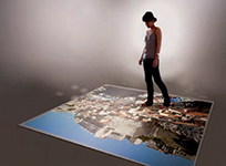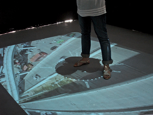 Une projection vidéo au sol. La personne qui tente l’expérience se place au centre de l’image et commande des séquences par ses gestes et déplacements sur l’image. Les différentes séquences rendent compte de déplacements réel dans l’espace urbain et d’actions de la vie quotidienne enregistrés par d’autres personnes. Elles sont coordonnées par les gestes de l’expérimentateur. Ce projet propose (de façon intuitive) d’expérimenter l’espace à la fois “hors la ville” et “dans la ville”. Il superpose différentes approches, nous propose d’aller à la rencontre des expériences de l’autre. C’est une nouvelle façon de se mouvoir dans un espace public. Une mise en scène du corps dont l’objectif est la constitution d’une représentation collective de la ville. La “Carte de l’Empire” est enfin réalisable. Les outils numériques nous permettent une réactivité en temps réel. « Je ne suis plus uniquement lecteur extérieur de la carte, mais je deviens aussi l’objet de ma propre observation ».