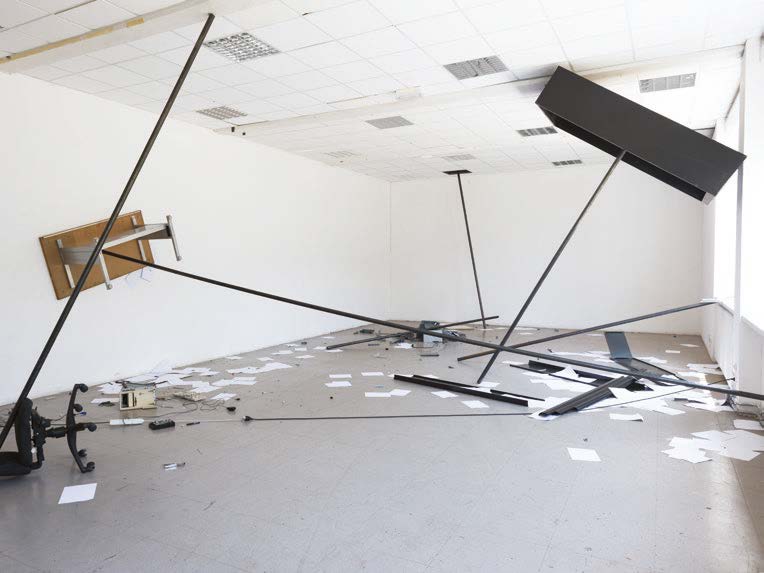 Un instant suspendu au creux de l’explosion géométrique d’un bureau. Plaisir de la composition intuitive et aérée d’une sauvagerie libératrice. Des tubes d’acier comme lignes de force, tendus, brisent la rectitude et le rangement autoritaire, dans l’espace étiré d’une architecture orthogonale sur-pressurisée parla colère.