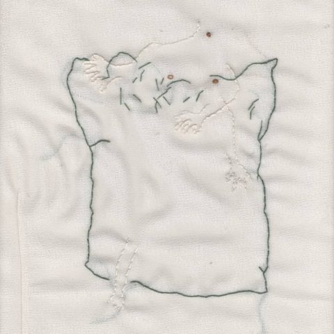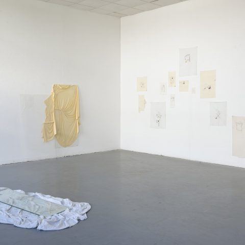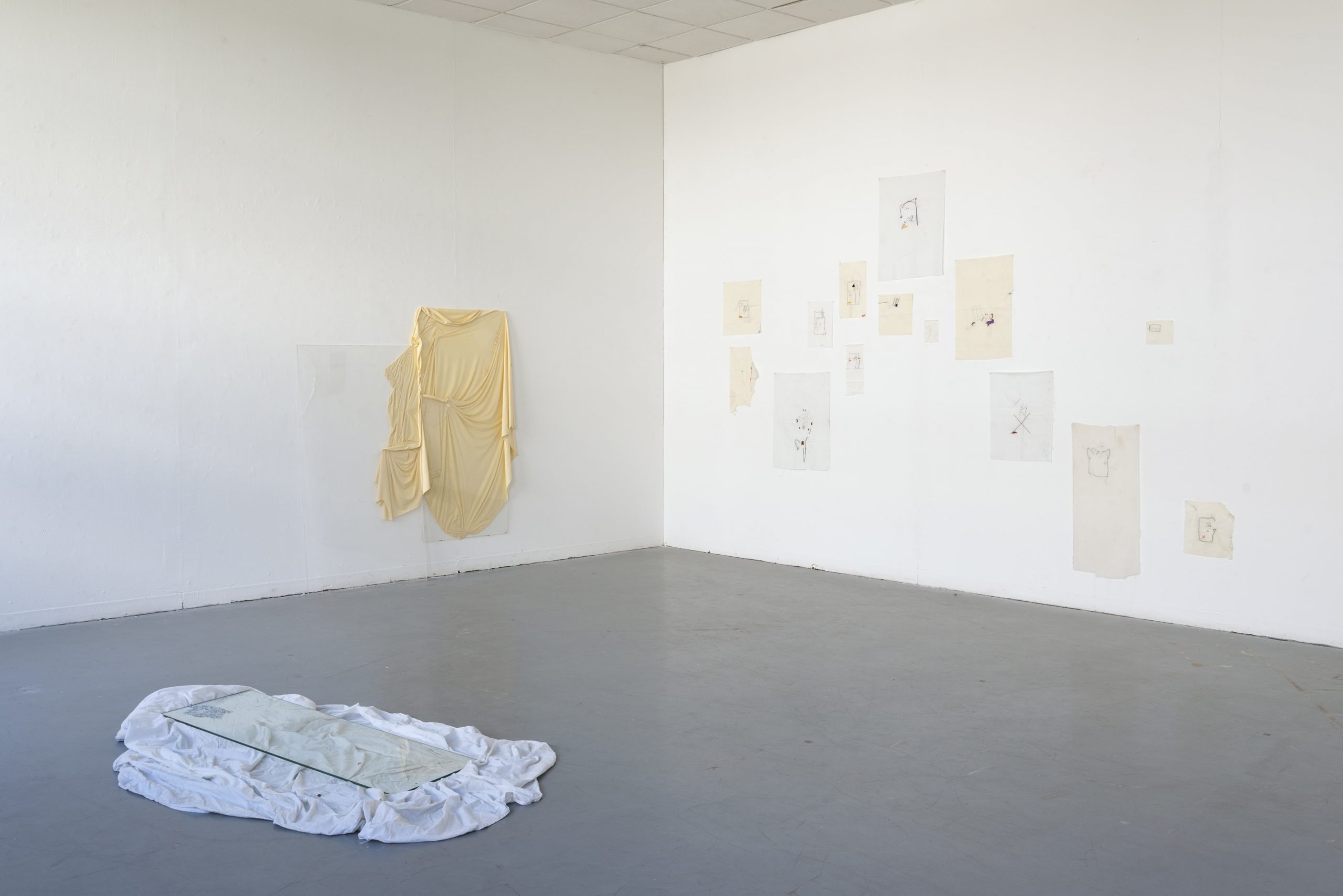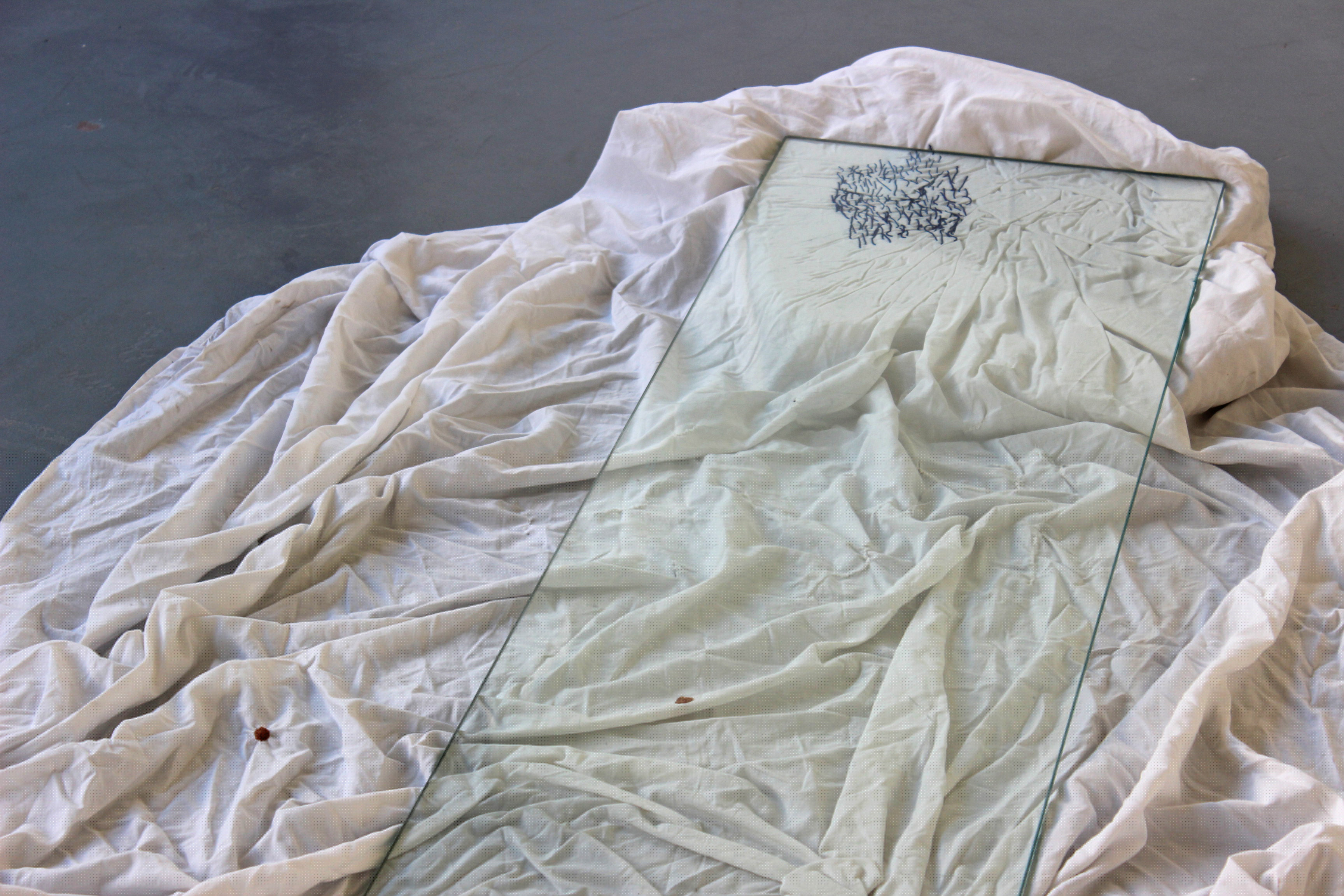 Par la suite se brode le souvenir d’un contact et d’une rencontre, rencontre entre la lourdeur du verre et la souplesse d’un drap, rencontre de plusieurs temporalités. A savoir, la méditation dans le temps de broder et l’émergence de l’image à travers la forme croquis du dessin.