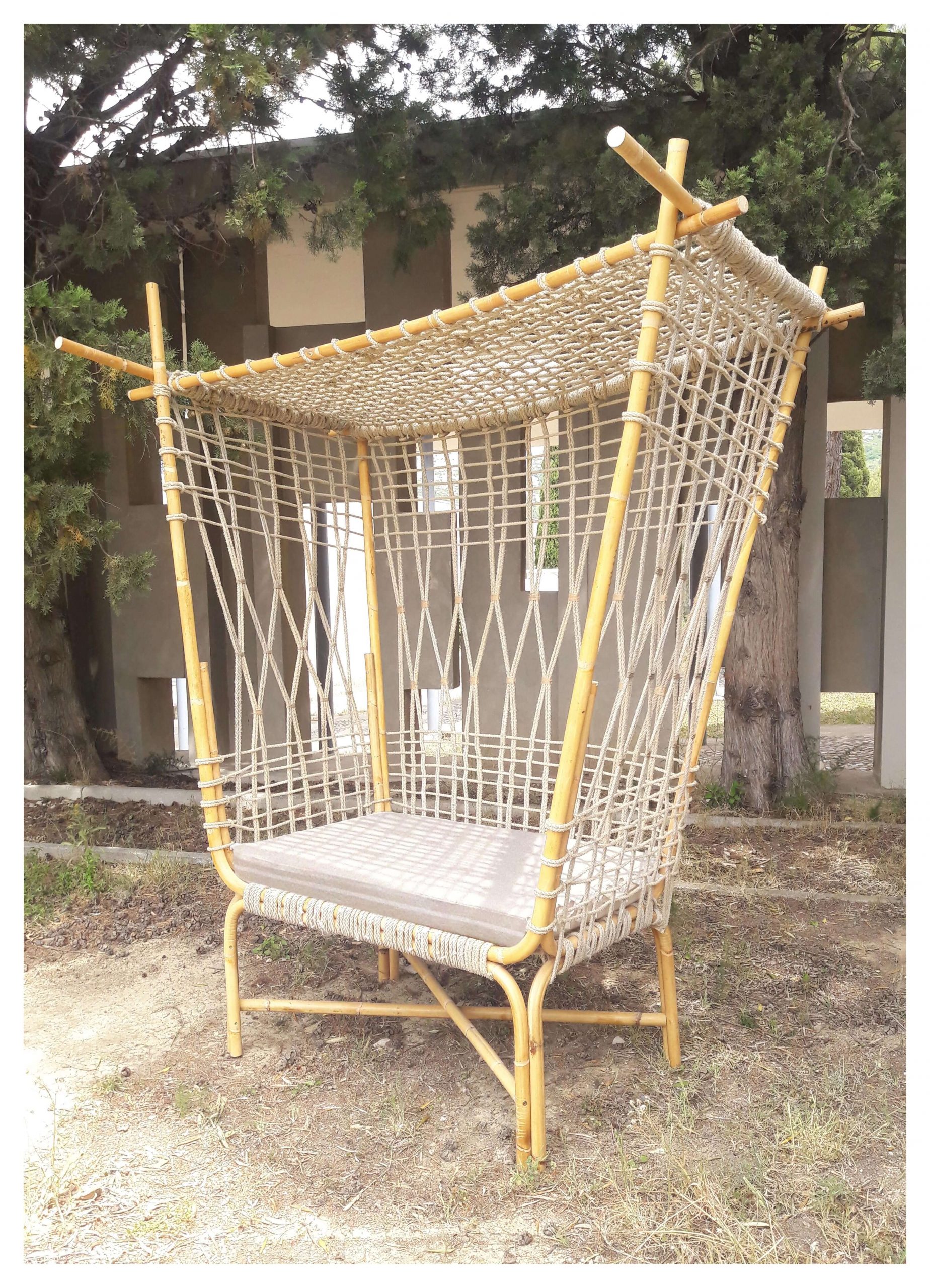Cette chaise, inspirée du moucharabieh, est un mobilier pour l’extérieur, elle s’installe dans le jardin. Semblable à un cocon pour un moment d’intimité, ou pour lire par exemple, sans être dérangé par le regard. Elle offre une ambiance relaxante en laissant pénétrer l’air frais et les rayons solaires à travers les motifs du tissage.