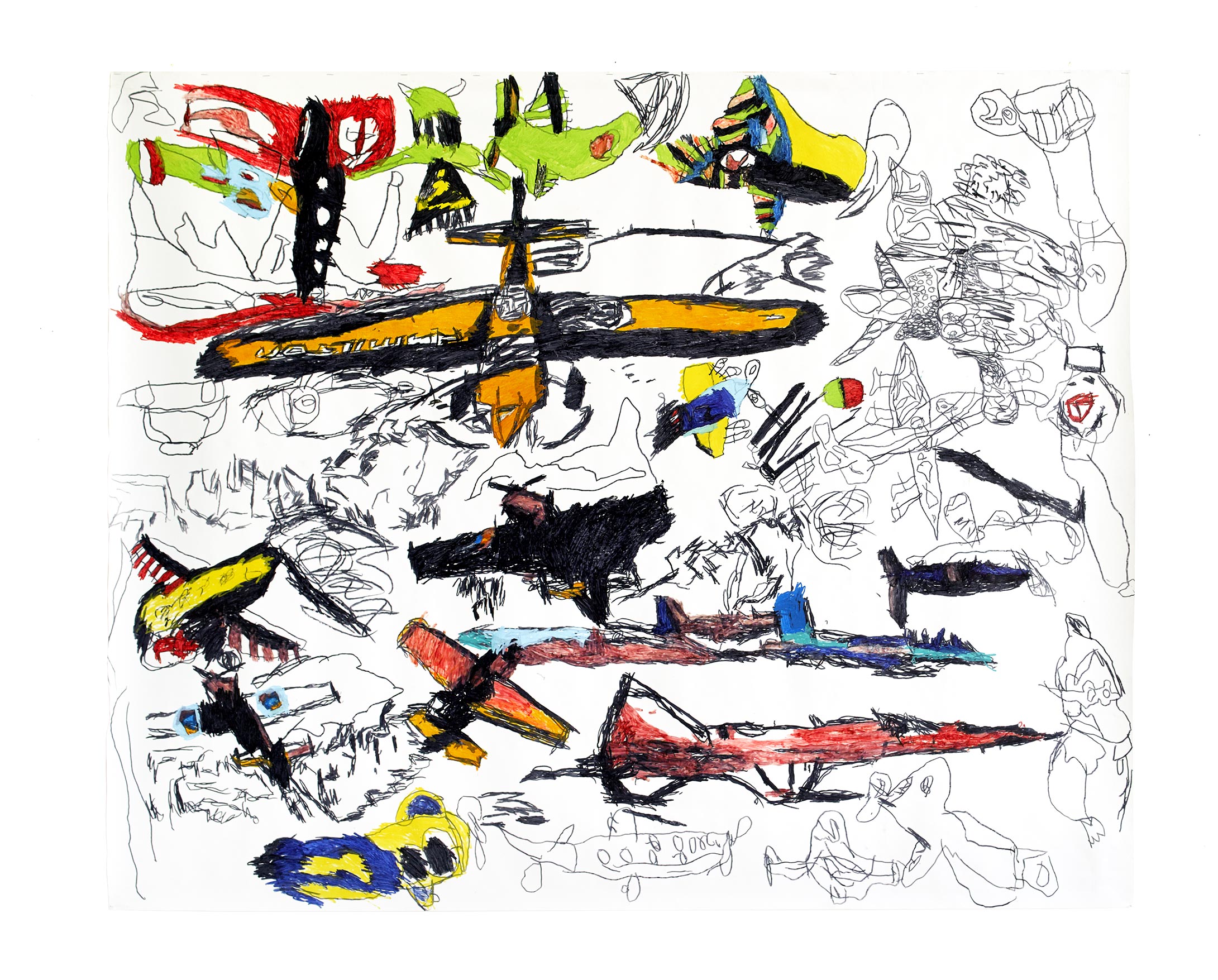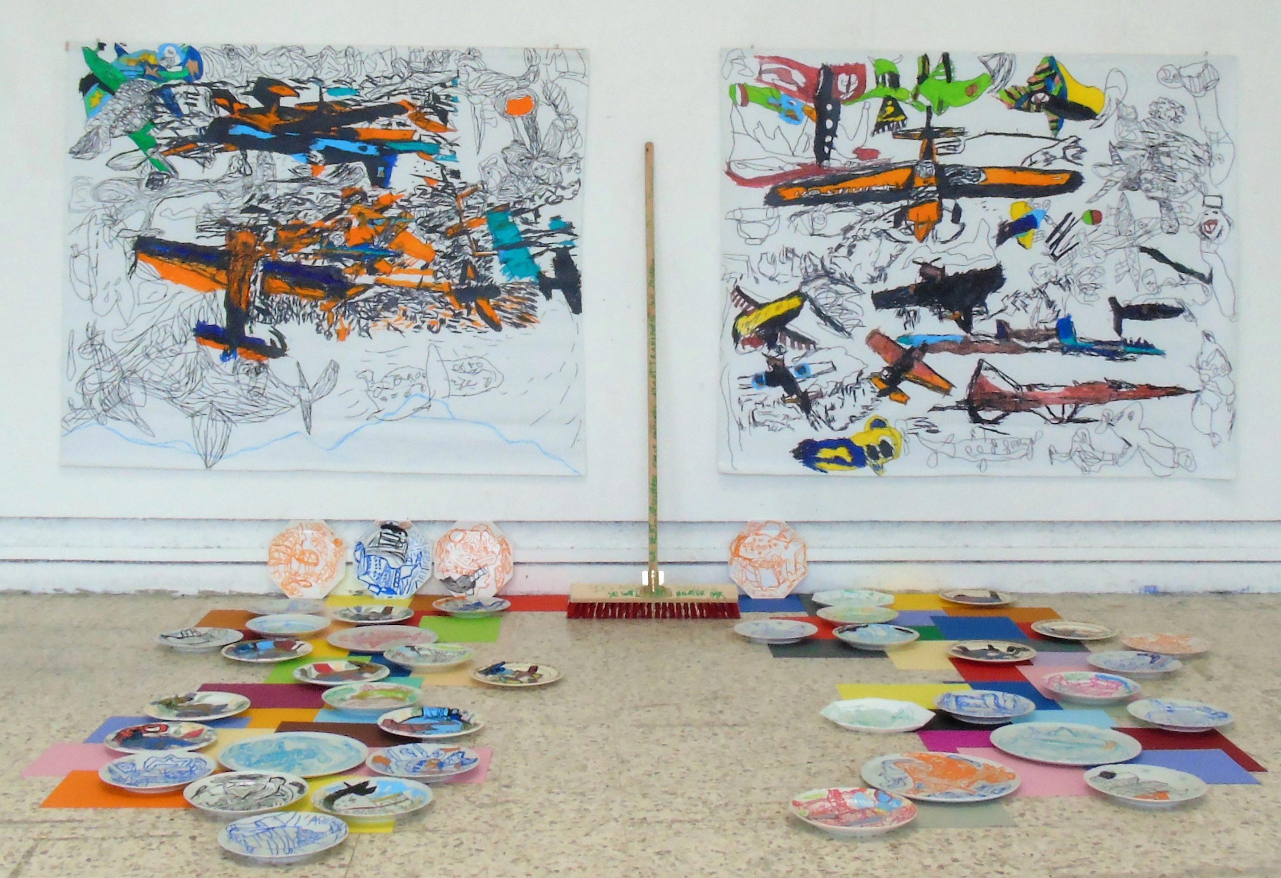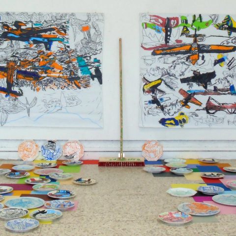 Travaillant sur la notion du Temps et plus exactement des différents temps qui me constituent, durant ce moment si particulier du premier confinement j’ai ressenti le désir d’exprimer deux choses : d’une part le besoin de déployer ma graphie sur des supports multiples, bâches et assiettes, afin de libérer l’énergie qui s’accumulait en moi à cause de l’immobilité forcée et d’autre part d’évoquer la fragilité du système économique par le biais de ces avions si fragiles , qu’ils se fracassent sur le tertre du désastre au moment où dans la cristallisation des jours je me recentrais sur mes vrais nécessités.