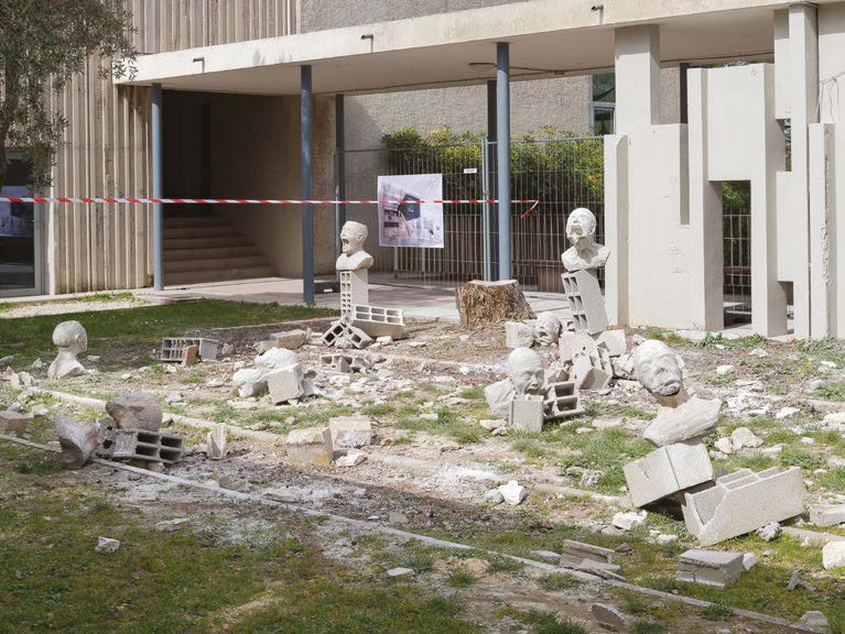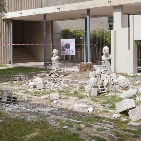 Toujours dans nos conversations, il a attiré mon attention sur la résistance des matériaux qu’il emploie mais aussi sur leur érosion et leur destruction. Ses installations tiennent compte de la temporalité de matériaux comme le béton, de la ruine précoce qu’il provoque, de la menace inscrite dans les bâtiments contemporains.