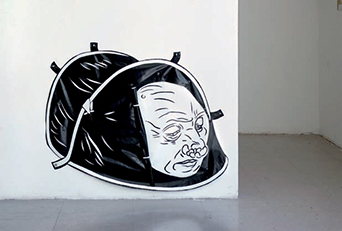Mes dessins sont une parade d’objets du quotidien qui s’associent, mutent et se travestissent dans la sobriété du noir et blanc. Reflet de nos délires fétichistes ou panoplie de nos tendances paranoïaques ? Dédale de panneaux publicitaires Avenir, bûcher de gants Mapa, Jack in the box voilé, tentes Quechua grimaçantes sont autant d’animaux domestiques déviants, évadés de notre album de photos souvenirs.