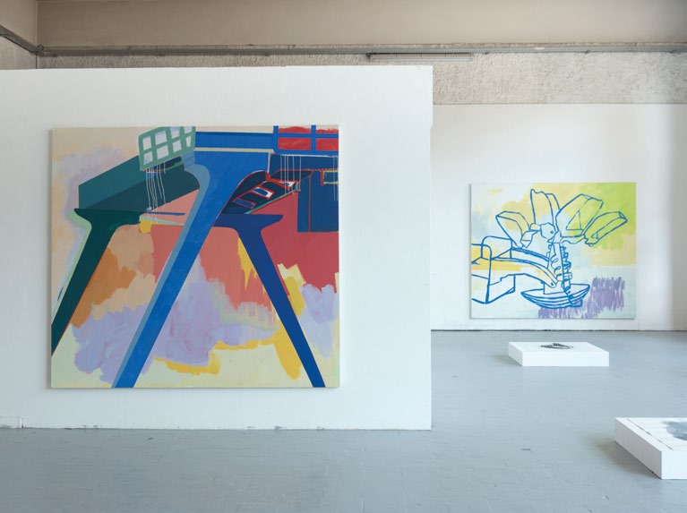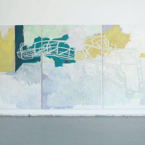 Ma recherche plastique se développe, d’une part, autour de la machine comme corps hybride dans une société cyborg où les corps s’interchangent au gré des transformations sociales, politiques et technologiques. Car bien que la machine ait été, et soit encore aujourd’hui définie principalement en des termes d’aliénation, c’est d’abord à mon sens une histoire d’émancipation. De corps émancipés, dont les combinaisons sont un infini de possibles. Un corps en recalcul perpétuel, en mouvement quasi perpétuel. Je récupère dans la ville et ses périphéries, des photos de machines et d’objets de toutes sortes, grues gigantesques ou bras mécaniques presque monstrueux, que je décortique et réassemble par le dessin et la peinture. Ce processus s’intègre dans une longue réflexion autant sur la peinture que sur le système sociétal contemporain. Les principes de rétroactions et de recalculs perpétuels sont l’une des portes par lesquelles je réfléchis l’une et l’autre. La peinture comme un espace de pensée perpétuellement remise en cause (par ses repentirs et ses capacités stratigraphiques) ; et les sociétés humaines comme énormes machines infiniment hybrides dont le système calcule perpétuellement son équilibre en avalant ou en gardant en périphérie des protubérances machinales. Extrait du mémoire