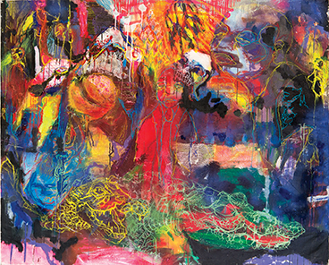 Les grands formats autorisent un geste proche de celui de « faire le mur ». L’écriture se transforme en dessin. Cette peinture est une bande-dessinée sans case où l’on croise des formes anthropomorphes : des chimères à mi-chemin entre l’homme et l’animal, un bestiaire des bas-fonds.