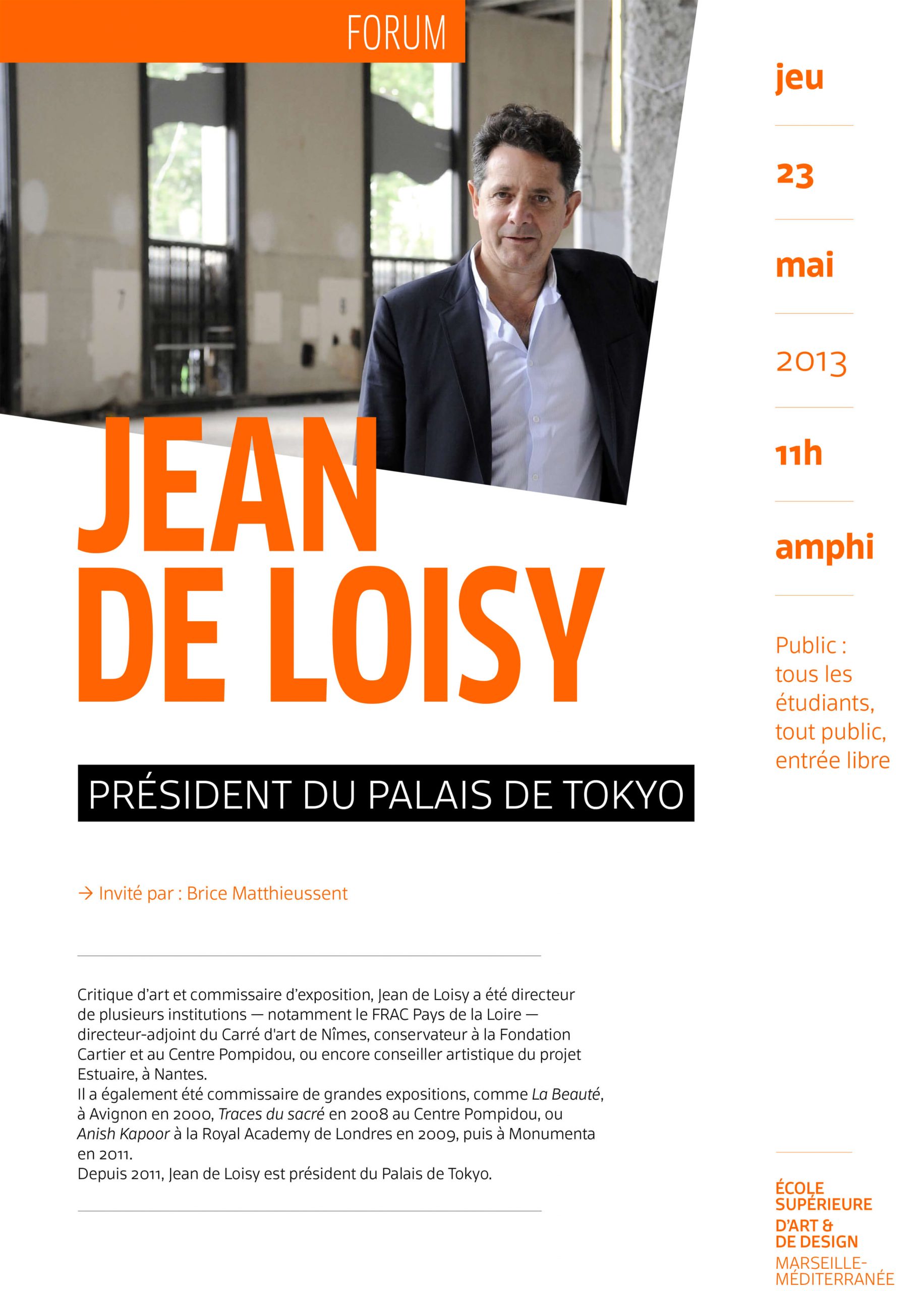 Il a également été commissaire de grandes expositions, comme La Beauté, à Avignon en 2000, Traces du sacré en 2008 au Centre Pompidou, ou Anish Kapoor à la Royal Academy de Londres en 2009, puis à Monumenta en 2011. Depuis 2011, Jean DE LOISY est président du Palais de Tokyo.