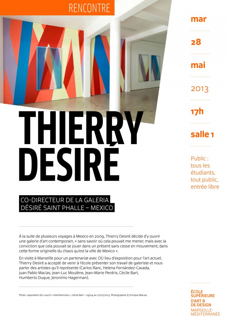 En visite à Marseille pour un partenariat avec lieu d’exposition pour l’art actuel, Thierry Désiré a accepté de venir à l’école présenter son travail de galeriste et nous parler des artistes qu’il représente (Carlos Ranc, Helena Fernández Cavada, Juan Pablo Macias, Jean-Luc Moulene, Jean-Marie Perdrix, Cécile Bart, Humberto Duque, Jeronimo Hagerman).