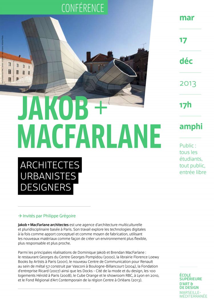 Parmi les principales réalisations de Dominique Jakob et Brendan Macfarlane : le restaurant Georges du Centre Georges Pompidou (2000), la librairie Florence Loewy Books by Artists à Paris (2001), le nouveau Centre de Communication pour Renault au sein de métal 57 construit par Vasconi à Boulogne-Billancourt (2004), la Fondation d’entreprise Ricard (2007) ainsi que les Docks – Cité de la mode et du design, les 100 logements Hérold à Paris (2008), le Cube Orange et le showroom RBC, à Lyon en 2010, et le Fond régional d’Art Contemporain de la région Centre à Orléans (2013).