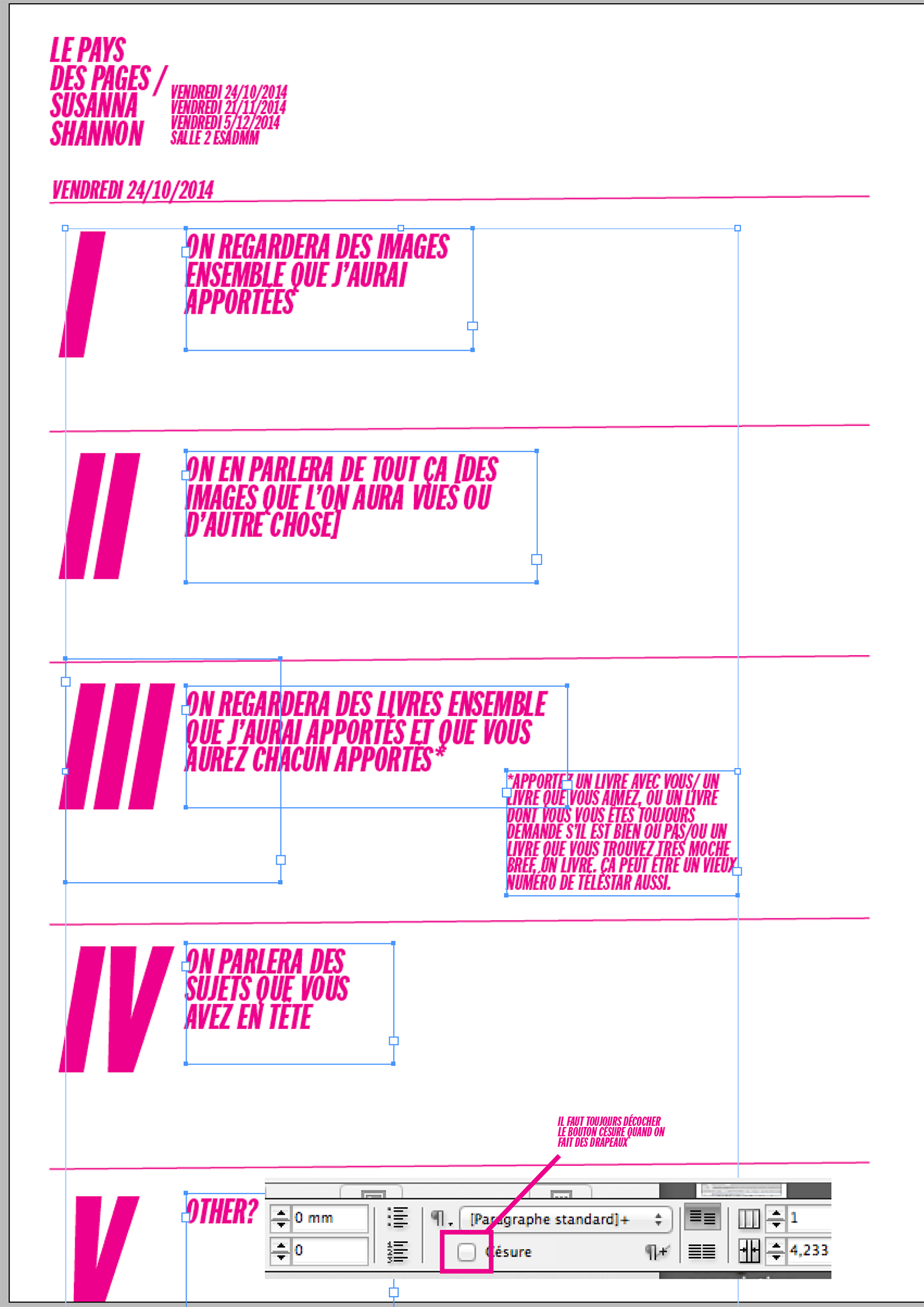 «Diriger la mise en forme de mémoires va bien au-delà de l’enseignement des «outils de mise-en-page» au sens strict, il s’agit d’assembler et structurer des propos et de la pensée tout à fait en amont pour en faire des ensembles formellement édités en utilisant le média de la page comme média de développement de pensée. Les questions de design d’exposition, de catalogues, d’ouvrages, de génériques de films ou de vidéo, peuvent être bien plus que de simples réceptacles pré formatés destinés à recevoir de la matière éditoriale préfabriquée, on peut mettre en place des approches très sur mesure.»