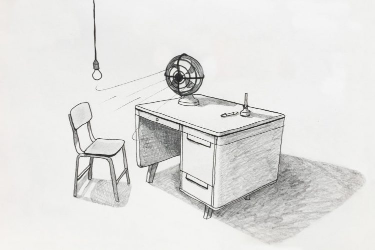 The two works disconnect haptic, sonic and visual elements to exhibit dynamic phenomena playing with invisibility. When Dislocation refers to sculptural gestures of minimalism, the setup with the desk in Moment brings to mind a representation of passing time in still life and vanitas paintings. The introduction of doubts in the viewer’s perception of simple everyday elements aims to blur the boundaries between physicality and memory, between reality and imagination.