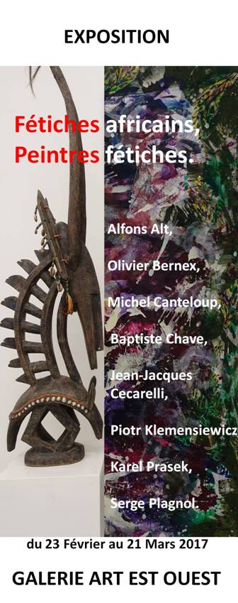 Dès sa toute première exposition, la Art Est Ouest Galerie a présenté, en contrepoint des toiles des artistes exposés, des statuettes et des masques des Arts Premiers; ils dialoguent avec les œuvres des peintres tout en séduisant par leur beauté intrinsèque. La galerie a souhaité pour l’exposition de février 2017 inverser la présentation: elle montre des pièces d’art africain en nombre- à découvrir pour leur richesse et leur diversité -poteaux, masques, fétiches, statuettes…accompagnés de toiles choisies des artistes de la galerie : Alfons Alt, Olivier Bernex, Michel Canteloup, Baptiste Chave, Jean-Jacques Cecarelli, Piotr Klemensiewicz (enseignant à l’ Ecole Supérieure d’Art et de Design Marseille-Méditerranée) , Karel Prasek et Serge Plagnol .